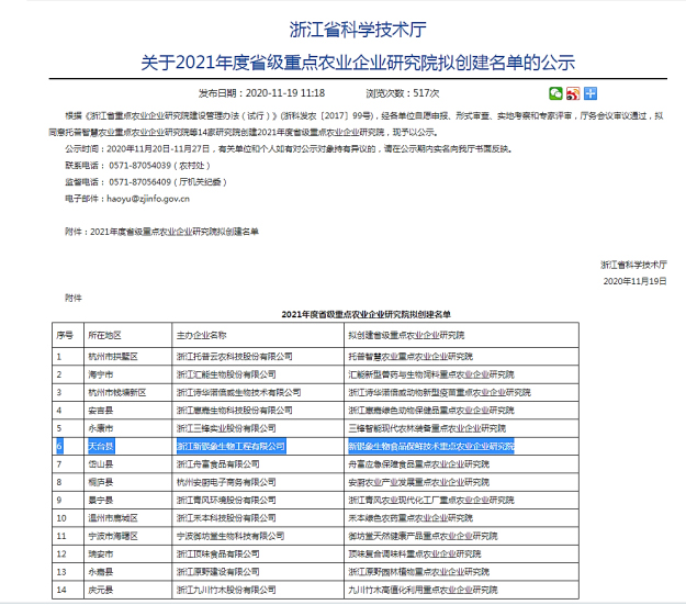 近日,浙江省科学技术厅2021年度省级重点农业企业研究院拟创建名单出炉,新银象公司榜上有名,为14家拟创建企业的其中一家。据悉,“新银象生物食品保鲜技术重点农业企业研究院”是天台县“首家”省级重点农业企业研究院,也是今年台州市唯一获创建的企业。