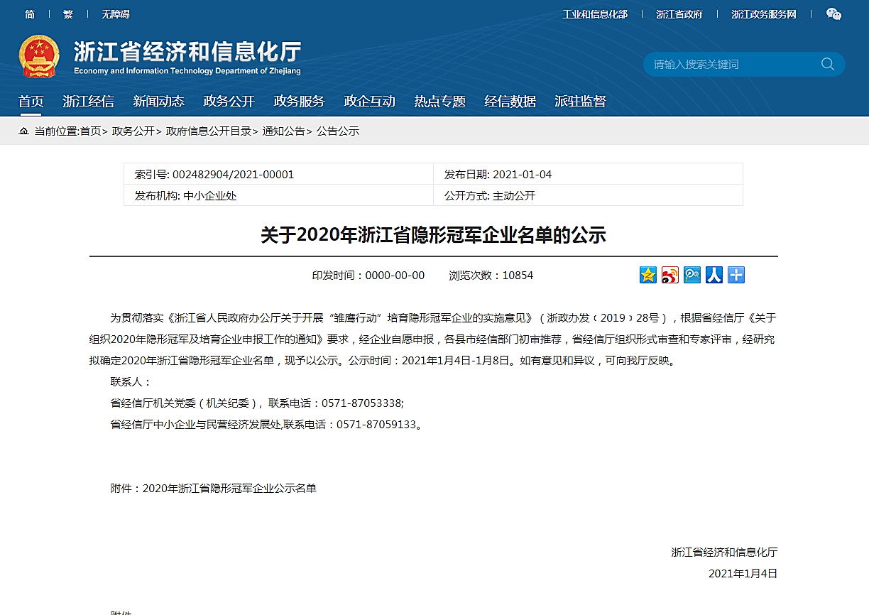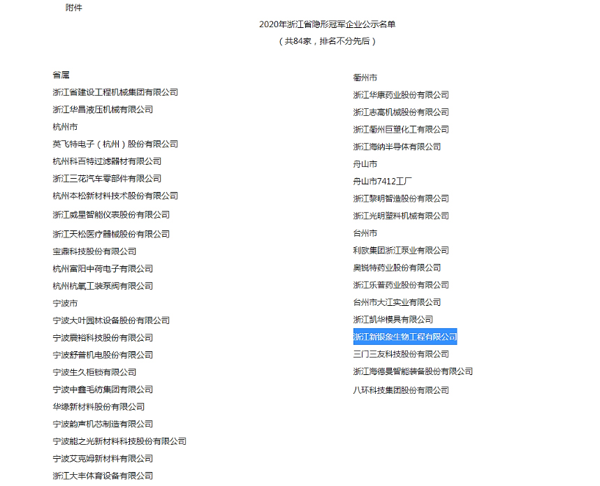 1月4日,浙江省经济和信息化厅公布了2020年度浙江省隐形冠军企业公示名单,新银象公司榜上有名!